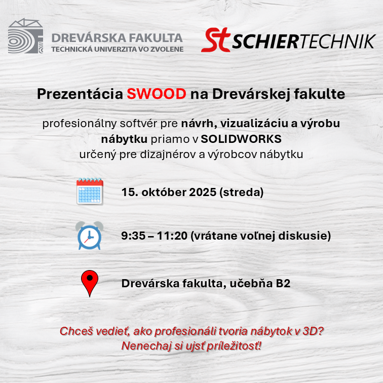 Drevárska fakulta v spolupráci so spoločnosťou Schier Technik Slovakia s.r.o. Vás pozýva na odbornú prezentáciu softvéru SWOOD, ktorý predstavuje špičkové riešenie pre návrh, vizualizáciu a výrobu nábytku priamo v prostredí SOLIDWORKS.