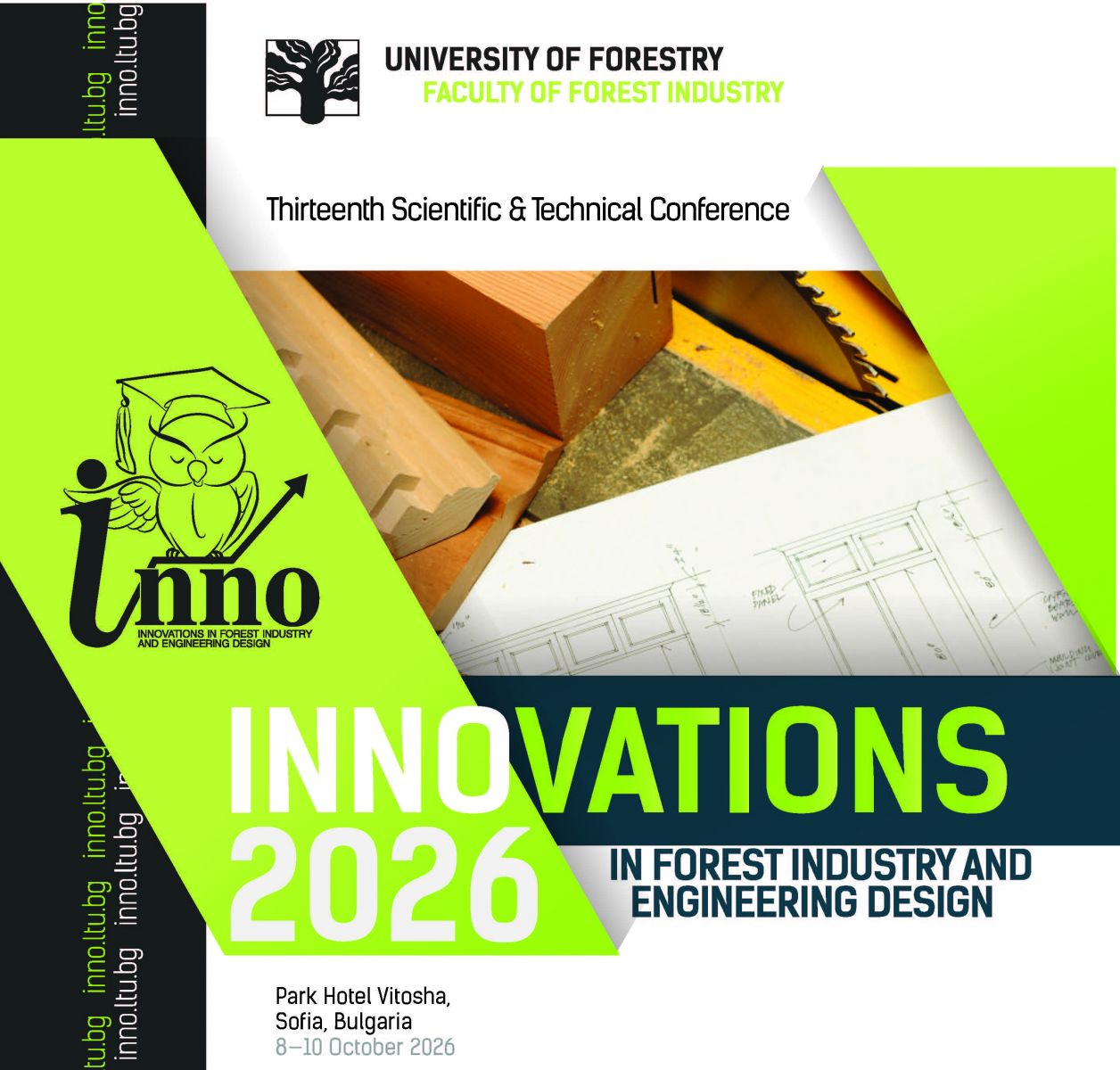 XIII. International Scientific and Technical Conference “INNOVATIONS IN FOREST INDUSTRY AND ENGINEERING DESIGN – INNO'2026”, to be held on 8–10 October 2026 at Park Hotel Vitosha, Sofia, Bulgaria.